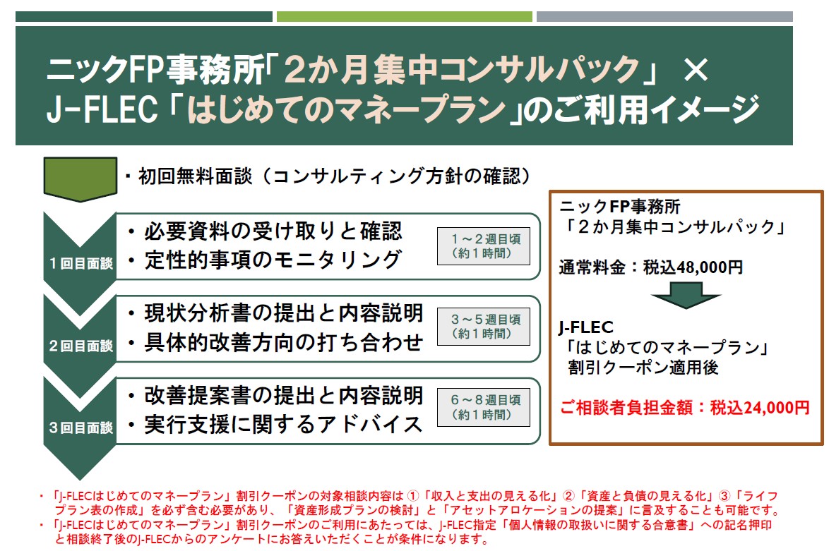 当事務所人気メニュー「2ヵ月集中コンサルパック」は金融経済教育推進機構の「J-FLECはじめてのマネープラン」割引クーポン事業対象です。通常料金は48,000円ですが、個人負担24,000円にてご利用いただくことが可能です。